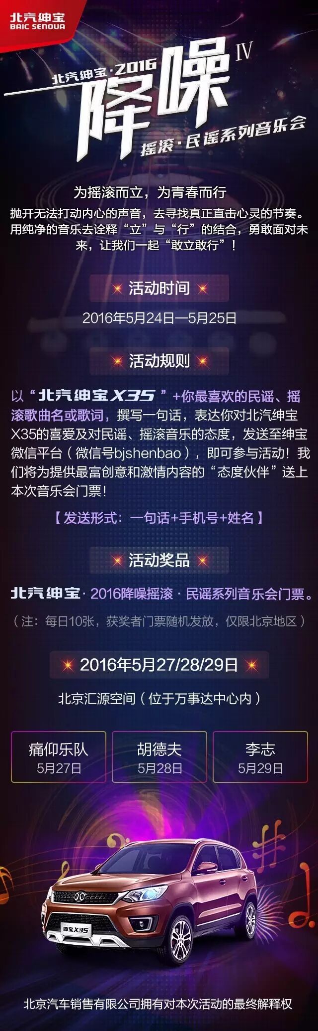 在1965年鲍勃·迪伦在新港(Newport)音乐节用电声吉他弹唱之前,很少有人能想到严谨理性的民谣会与摇滚乐相互结合。半个世纪之后,北汽绅宝重拾摇滚民谣经典,将于5月27日—29日在北京汇源空间唱响“2016降噪Ⅳ·摇滚民谣系列音乐会”。今夏最强“降噪”阵容摇滚劲旅痛仰乐队、民谣诗人胡德夫、全能歌者李志,将与北汽绅宝X35共同演绎一场“降噪”风暴,一场直击心灵的音乐盛典即将开启!