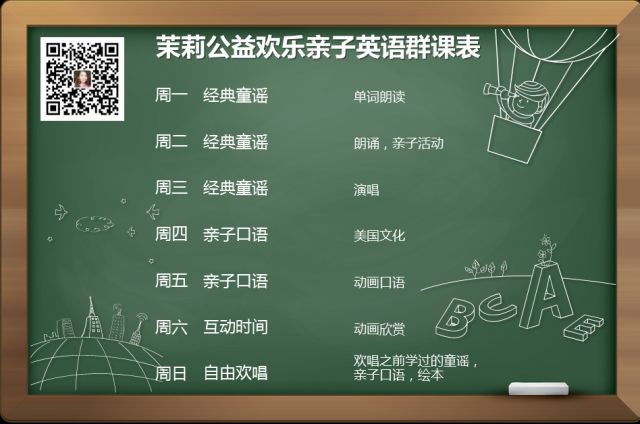欢迎加入12大茉莉公益欢乐亲子英语群, 请回复“入群”到公众号平台,即可获得入群方式。