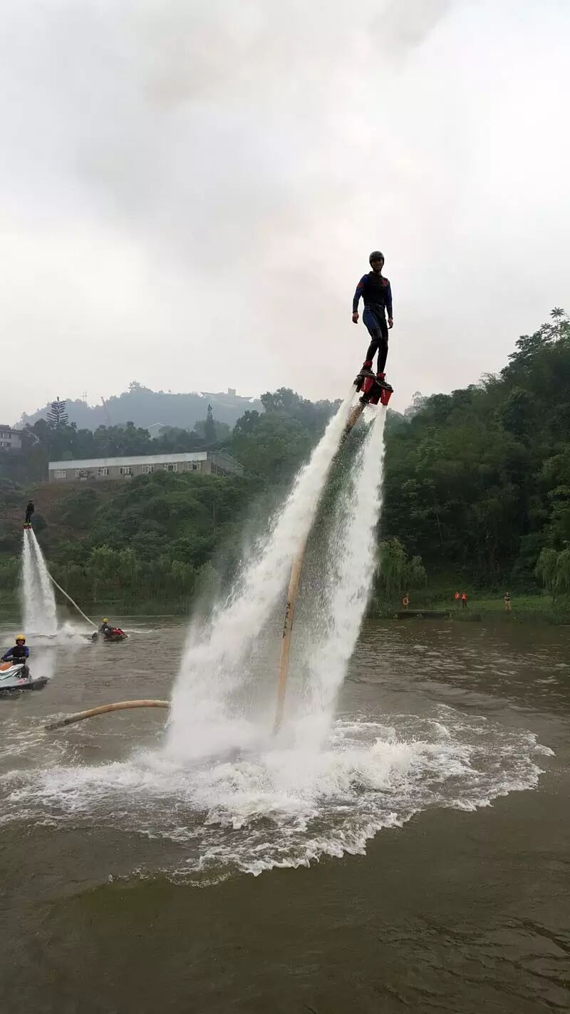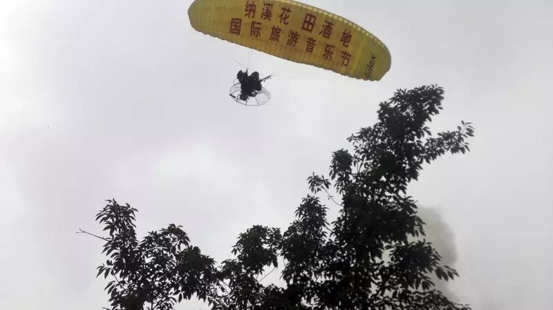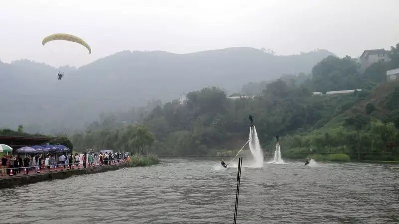 原来,河面上正在进行水上飞行器表演,与此同时天空中也有一名驾驶着滑翔机的表演者向着舞台方向飞来,“空中飞人”和“水上飞人”的结合,让大家忍不住鼓掌叫好,并拿出手机记录下这一精彩难忘的一幕。