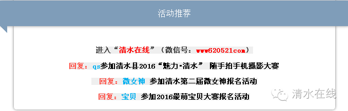 清水在线微信号:www620521com☀清水本地最具影响力的新媒体品牌,主营业务:活动策划、微信推广、网站建设、网络广告,LED、公交车视频广告。合作热线:0938—7168588:;18298307579 ☀了解: 清水微生活;添加微信:qsw0938或qs0938为您免费发布各类便民信息。网站、微信、朋友圈、DM报纸同步免费发布。、