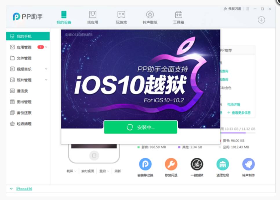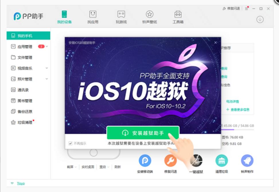 目前呢, PP 助手上支持的是 iOS10.0-10.2 越狱,当然在越狱前一定要记得给你的 iPhone 进行备份。