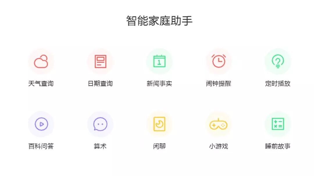 天气查询、日期查询、新闻事实、闹钟提醒、定时播放、百科问答、算术、闲聊、小游戏、睡前故事等,让你的生活更便捷有趣。