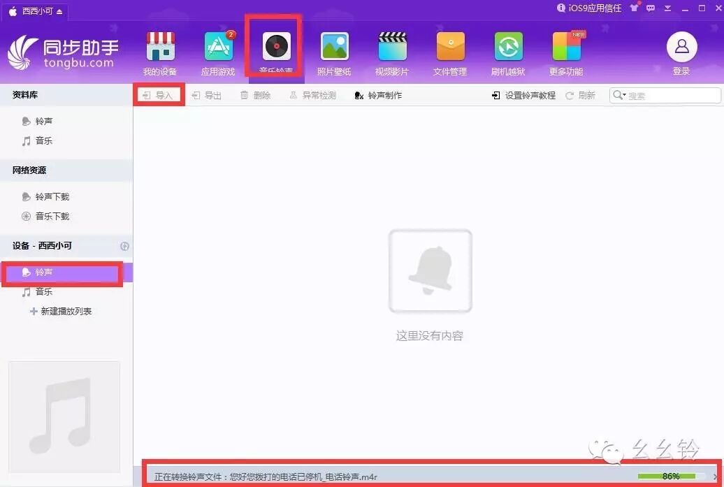 找到工具栏里的“铃声”,点击“导入”,把存在桌面上的铃声导入到铃声里;