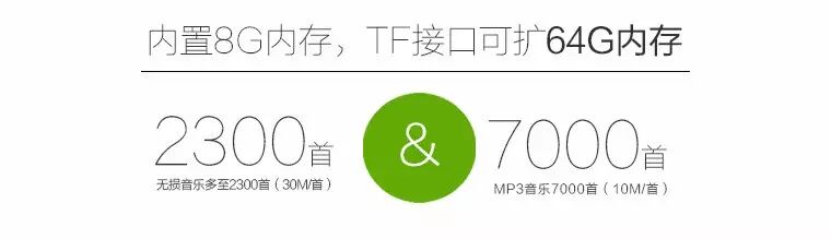 内置8G内存,TF接口可扩展64G内存,最多可存储约无损音乐2300首(30M/首)或320Kbps高品质MP3音乐7000首(10M/首),给您无限可能!