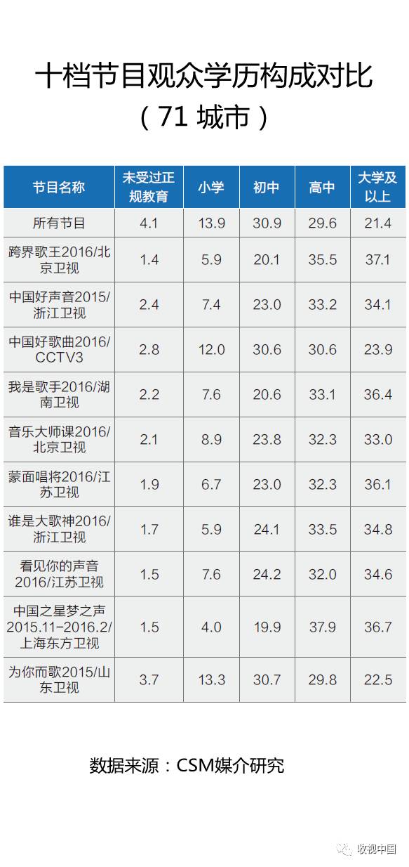 通过对比10档节目观众集中度发现,《中国之星梦之声》、《我是歌手》、《中国好声音》、《蒙面唱将》和《跨界歌王》等都是观众的学历越高集中度越高,说明季播音乐类综艺节目表现出吸引高学历观众的一致性。但是《中国好歌曲》和《为你而歌》表现与众不同,这两档节目都是吸引中等及以下受教育程度的普通大众收看能力较强。