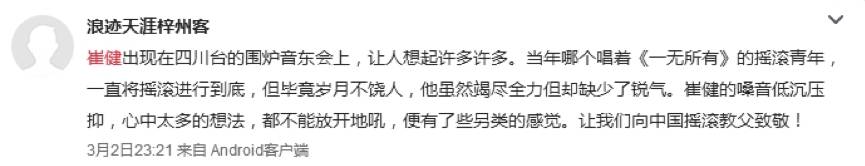 如今在电视节目中能够直接看到崔健的live秀,看到的是依旧头戴红星帽子的崔健,“又健雾霾”的批评与反思,《快让我在雪地上撒点野》的狂放,《出走》的脆弱,《酷瓜树》的压抑,《像一把刀子》的锋利……观众说在电视上看到还是那个摇滚的崔健,听了歌,就忍不住上微博点赞,歌声锋利如刀,回忆却似水柔情——