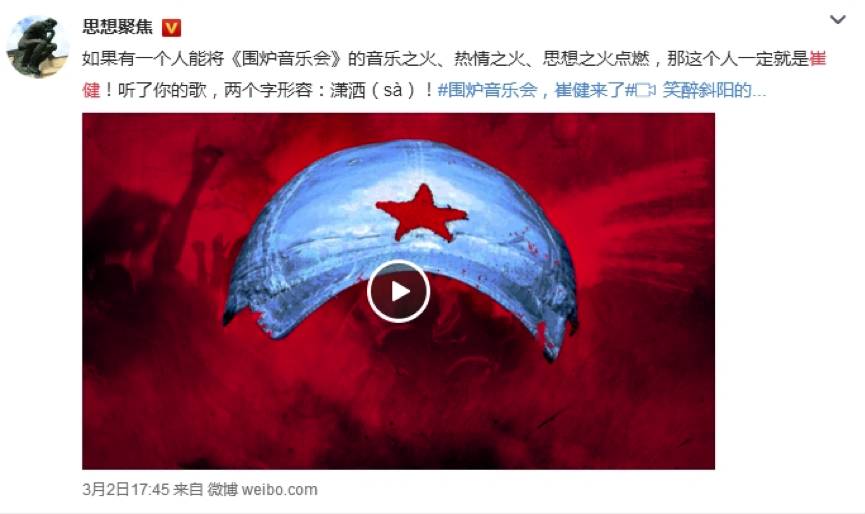 一档不做话题,不玩炒作,不迎合年轻观众口味的音乐节目,在四川卫视这个国内并非极致的电视平台播出,却偏要以走心的制作和真心的自我表达赢取口碑。《围炉音乐会》一经播出就引发观众刷屏热议,在电视上“撒了点野”。作为二线卫视的四川卫视,在去年底和今年初就是凭借音乐节目完美逆袭,经典案例还包括2017年“花开天下”跨年演唱会,,不仅顺利拿到名额,还平台、投入、阵容以及播出时间并不占优的情况下,主打差异化,突出音乐纯粹感,升级演唱会live感,最终收获了不俗口碑和观众满意度。