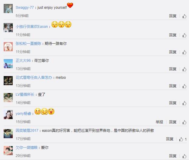 看看微博上 全世界爱Eason的小小伙伴的呼声!是不是感觉压力山大,不要紧张,记住Eason的歌~阴天也要快乐哦~