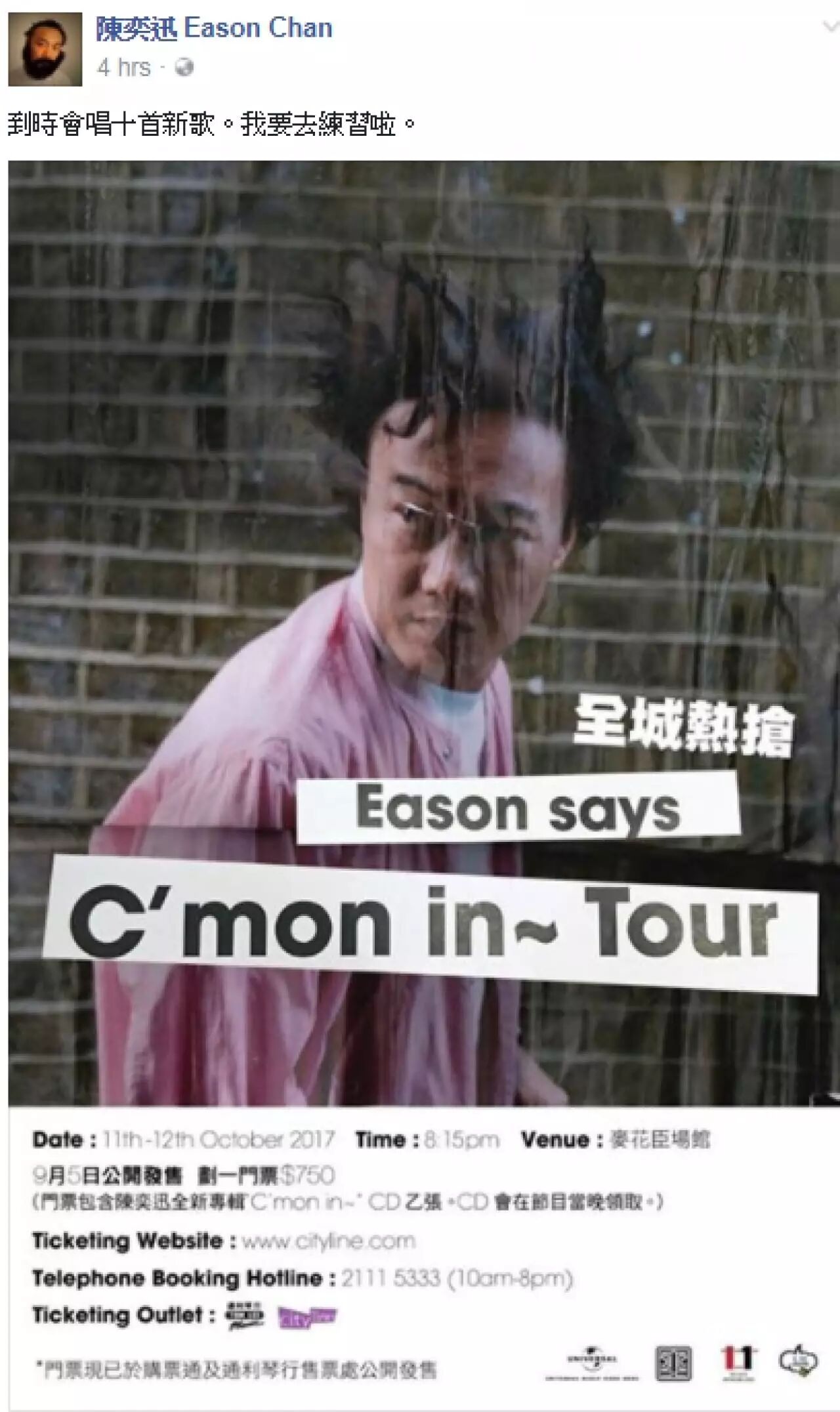 自2013年《EASON's LIFE》红馆演唱会后,陈奕迅(Eason)一直没有再于香港举办个人演唱会。至昨日终有喜讯出现,这位被称为是当代香港歌神昨日举行记者会,并宣布举办「Eason says C'mon in~Tour」并于10月11、12日在旺角麦花臣场馆举行。