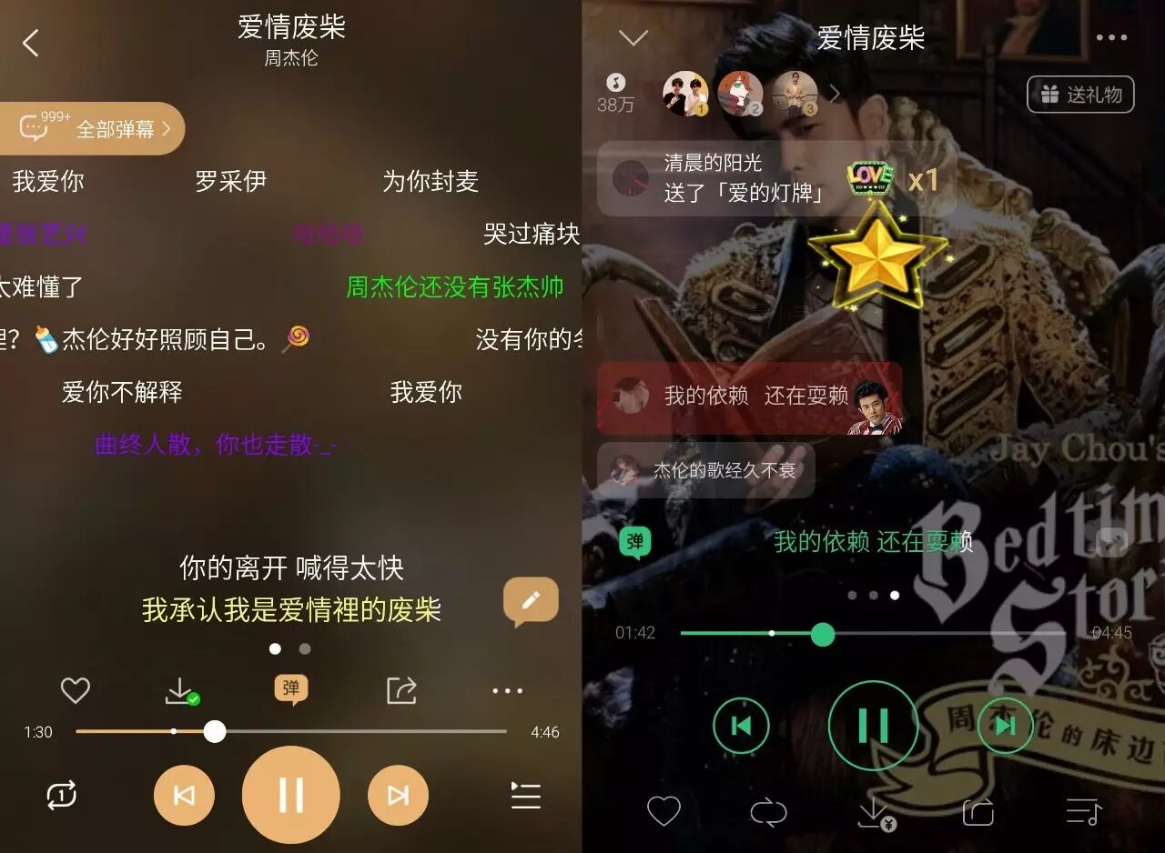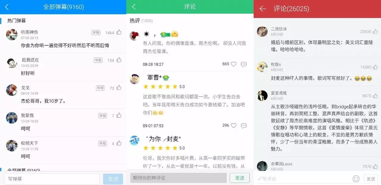 在娱乐性较强的弹幕方面,尽管酷狗提供了查看全部弹幕功能为弹幕添加了评论的性质,弥补了弹幕不可重复阅读的缺陷,但是由于弹幕本身内容简短的特质,其评论质量相对比较低。QQ利用个性化的气泡推出崭新的弹幕展示方法、附加了送礼玩法,趣味性较酷狗更强,单独的评论模块也为有质量的评论提供了一个窗口,但是众口难调的音乐领域是否适合评论+评分制度还值得商榷。相比之下,网易云简单的评论功能虽然没有那么强的娱乐性,但简约的界面无形中提升了评论的质量。