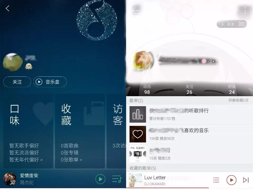 QQ和网易云都利用个人主页来进行个人展示,QQ的主页展示主要靠口味、收藏、创建歌单等构成,偏重于个人性行为,布局上留出大片空间展示用户个性化封面,下部不同模块通过将访客模块露出一部分诱导用户进行左划操作,获取更多信息。