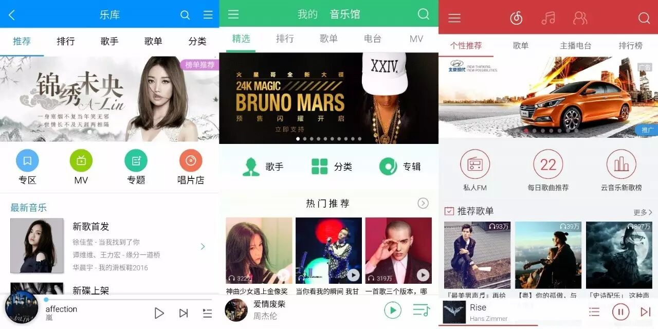 三款产品都具备最基础的歌曲搜索、下载、收藏(喜欢/最爱)、评论、分享、歌单创建、听歌识曲、个性推荐、桌面歌词等功能,提供排行榜、分类、场景化选择等信息,这里注重讲一下他们差异化的体现。