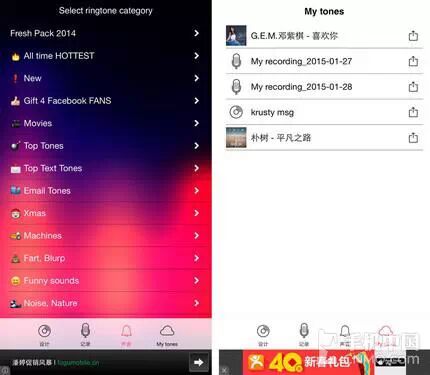 录制完成的声音将在My tones中显示,可直接分享至社交平台,或作为邮件发送,要是您觉得自己做铃声太麻烦,也可以选择应用中提供的,下载后可直接使用,小编已经试听了几个,那音效绝对会突破您对铃声的理解,已经不能用个性这个词来形容了,使用时需要足够勇气面对周围人的目光。