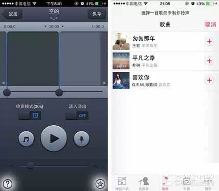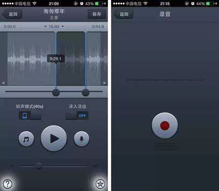《Ringtone Maker》提供了两种铃声模式,30秒和40秒,用户可根据需要选择,并且还带有淡入淡出效果,让制作出的铃声更为温和悦耳。除了截取之外,用户还可自己录制音频,要是觉得自己嗓音还不错不妨高歌一曲,用它做铃声绝对不会跟别人重复,当然您也可以用它来录制其它声音,个性这种事还得靠自己。