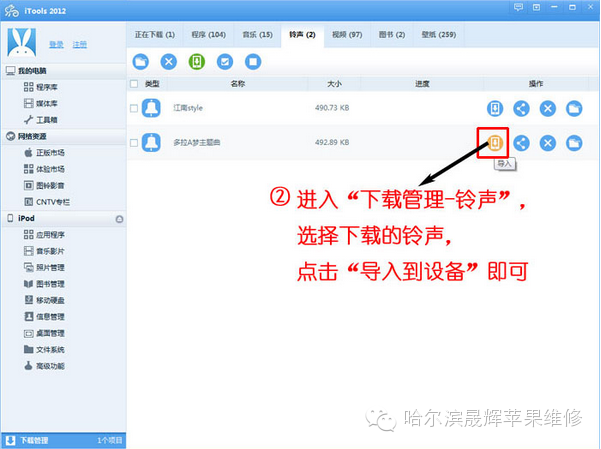 打开网络资源—图铃影音—铃声—搜索喜爱铃声。进入下载管理-铃声,选择铃声并导入设备即可。
