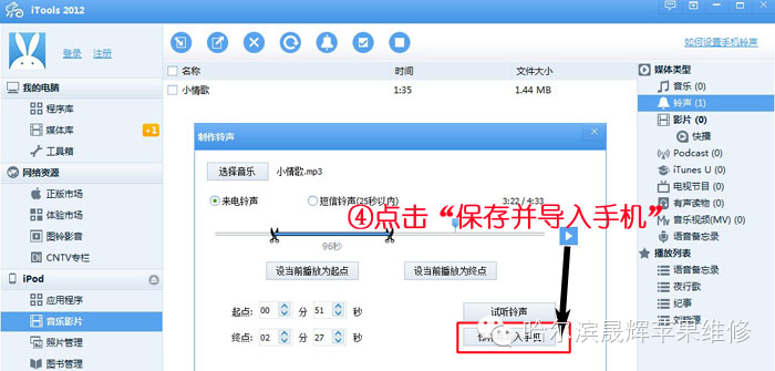 (由于iOS系统限制,手机铃声45秒,短信铃声为25秒, iTools剪辑短信铃声时最多截取25秒哦。)