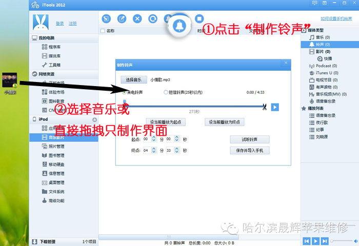 设备连接上itools之后,打开【音乐影片】-【铃声】,点击“制作铃声“,直接选择歌曲或将音乐拖入制作页面。