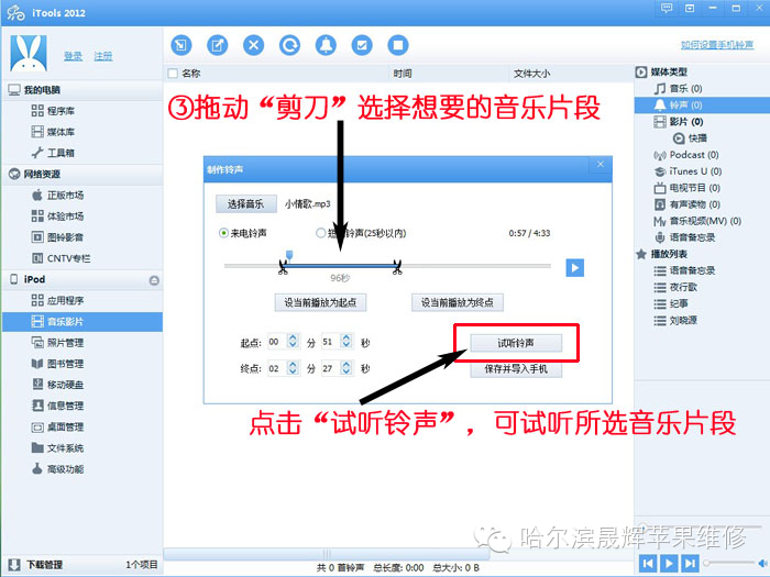 拖动“剪刀”选择要剪辑的音乐片段。点击“试听铃声”,可试听所选音乐片段。