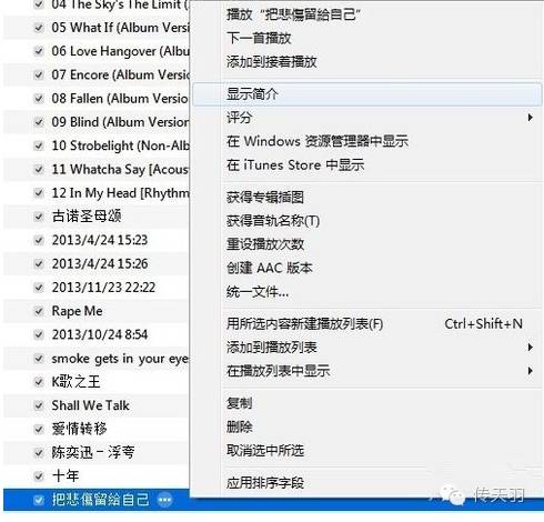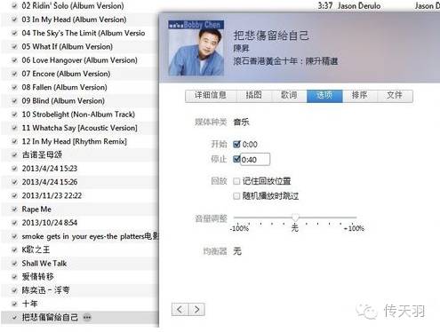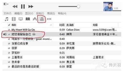5.点击菜单栏下面的 音乐 图标,右键点击刚刚添加的音乐文件名称——显示简介——选项:设置铃声开始与结束时间,长度不能超过40秒,确认(下图是小羽君在网上找的教程图,因为电脑里没有音乐)