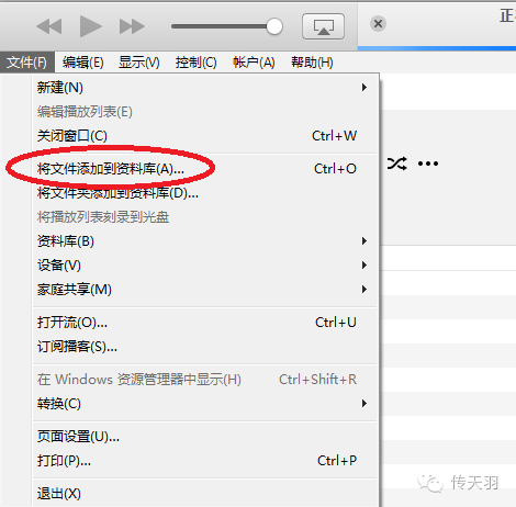 3.点击 iTunes 左上角的菜单按钮,在弹出的菜单中选择“将文件添加到资料库”