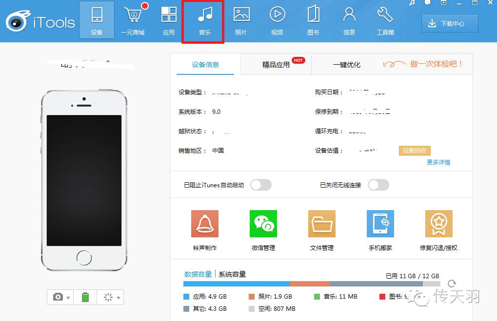 1.电脑或者手机直接下载iTools工具,这里演示的是电脑版,将手机连接到电脑上,直接就能看到音乐那一栏