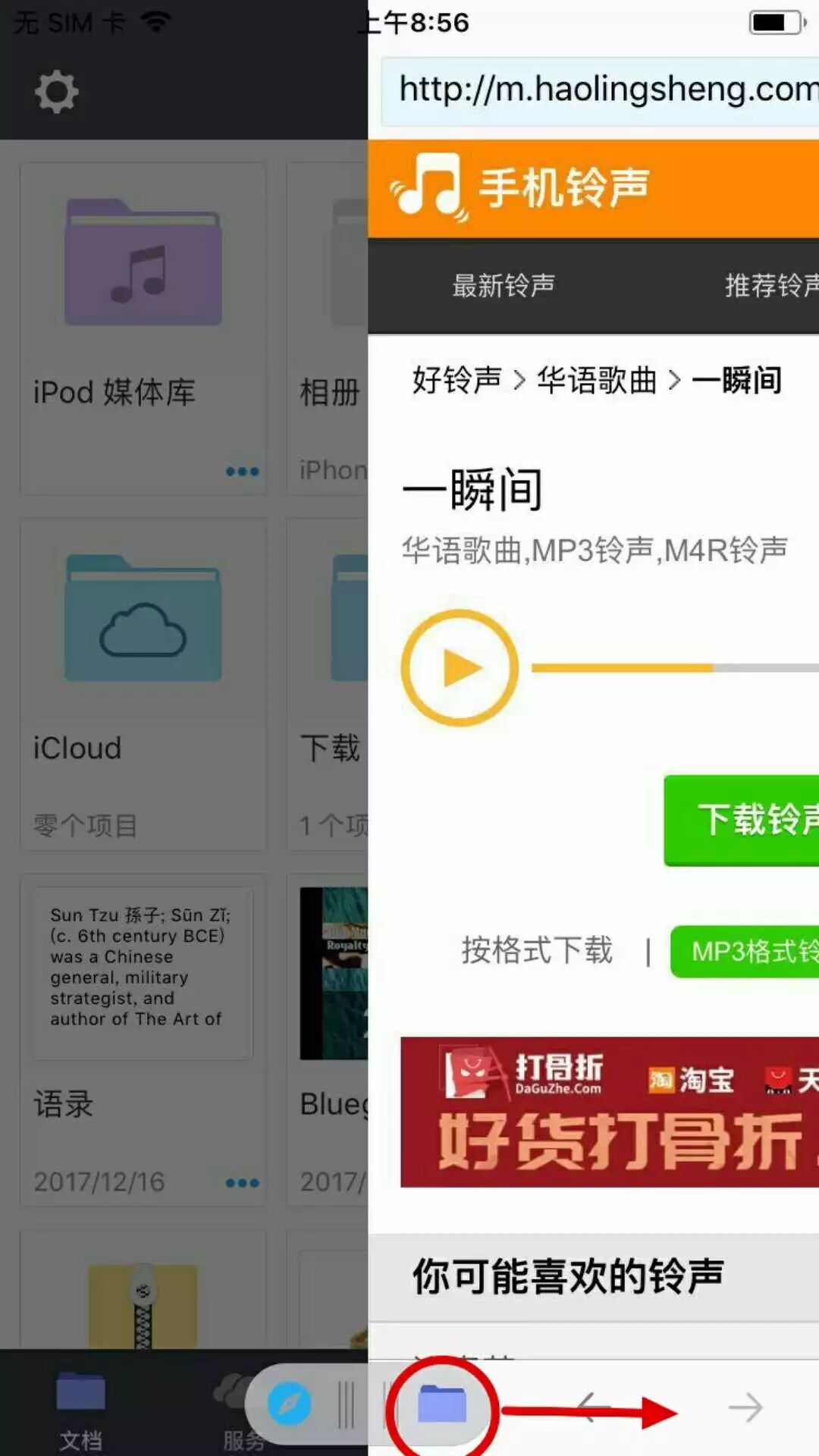 它的操作逻辑其实并不复杂,就是用Documents这个软件下载好铃声导到“库乐队”这个软件,再用“库乐队”导出变为手机铃声。