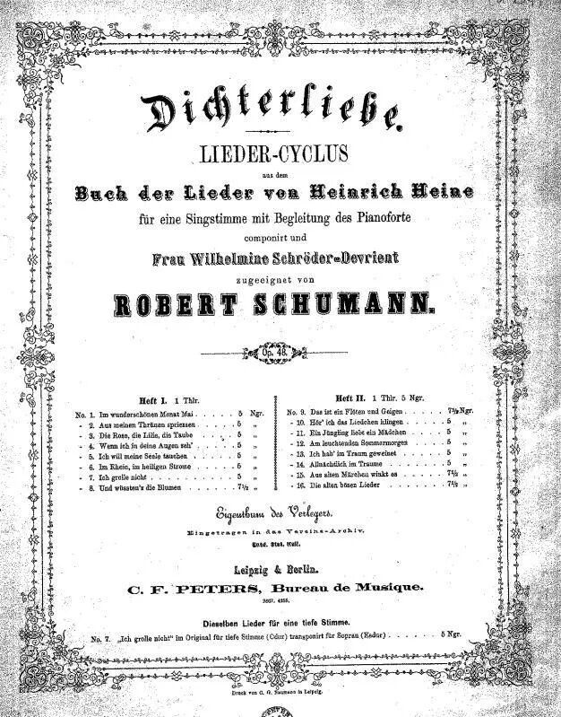 作品48《诗人之恋》(Dichterliebe)谱自海涅诗集《歌集》(Buch der Lieder),这是海涅18、19岁到30岁的作品集,内容主要以他和两位表妹的恋爱经纬为题材,描述青春的爱与苦恼。舒曼从其中的“抒情插曲”一辑中选出了16首诗,谱成仿佛有情节可循的联篇歌曲集,并且冠以标题“诗人之恋”。