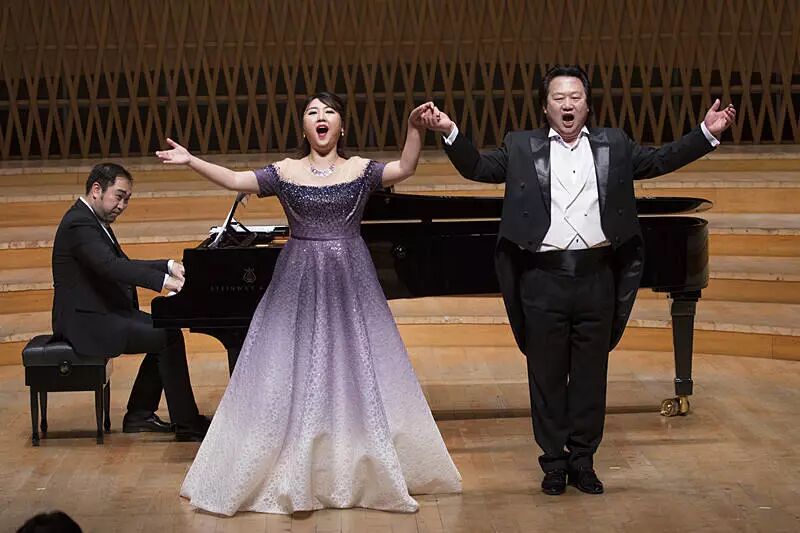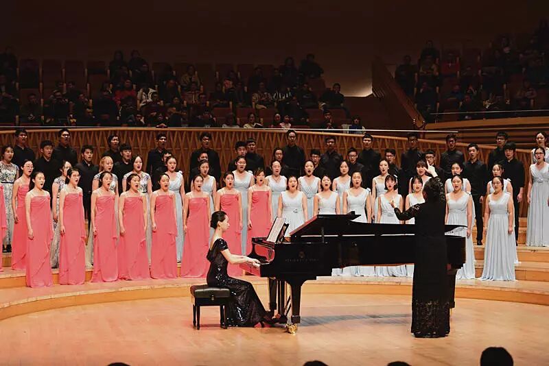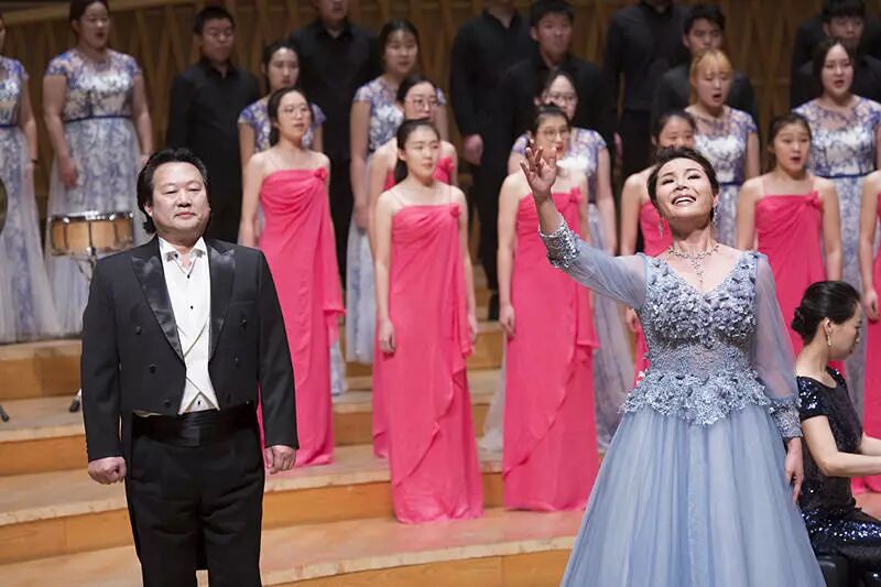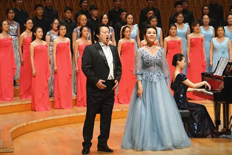 声乐教授李建林和青年教师王思思老师担任领唱的《祖国颂》恢宏亮相