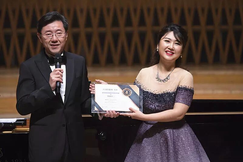 两曲唱罢,王勇教授向熊郁菲颁发了上海大学音乐学院特聘教授证书,随后,熊老师与李建林教授合唱了一首《祝酒歌》。
