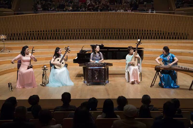 由民乐团指导老师任华清、徐榕野、乐团外聘指挥姚晓蕾以及学生共同演绎的丝弦五重奏《天山之春》、《欢乐的夜晚》生动表现了节目里人们欢畅喜悦的心情,契合主题