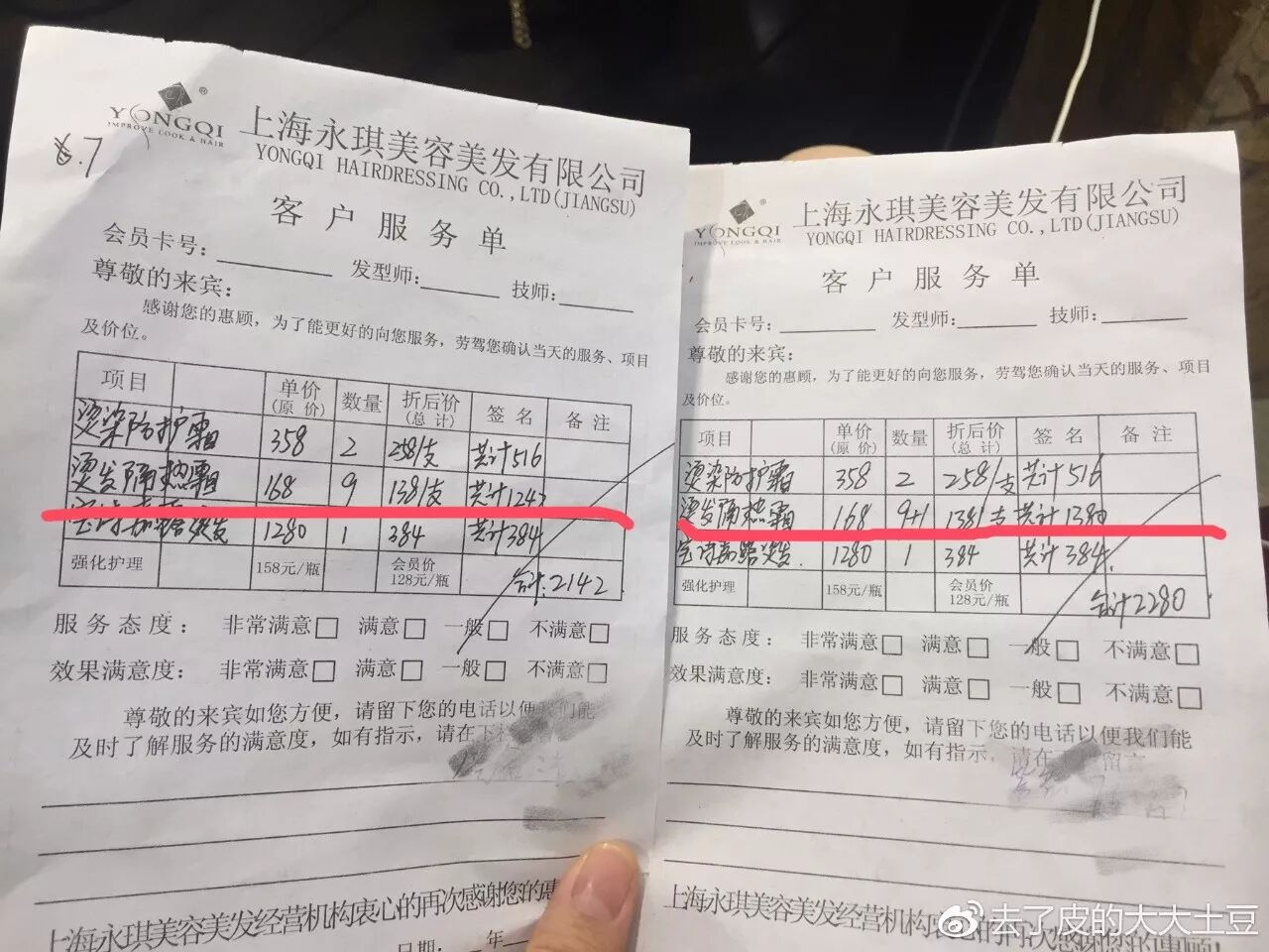 烫发前,店员跟她们推荐了一款保护头发的“烫发隔热霜”,报价168元一支,打折后138元一支,当时两人觉得价格还行就答应了。仪器上完,签单时才发现,所谓的“烫发隔热霜”并非一次一支,而是根据烫发时所用的卷发棒数量来计算,小黄9支,消费1242元,朋友10支,消费1380元,再加上其他费用,两个人一共花费了4422元。