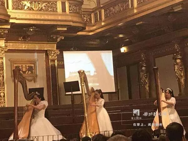 奥地利时间八月十三号晚7点,奥地利2017年暑期音乐会在维也纳金色大厅唱响,来自中国、德国、法国、奥地利等国家的演出团队给现场的2000多位观众带来一场听觉盛宴,而第一个亮相的节目,就是开化姑娘汪丽萍和两个学生用竖琴演奏的经典曲目《爱的罗曼史》。