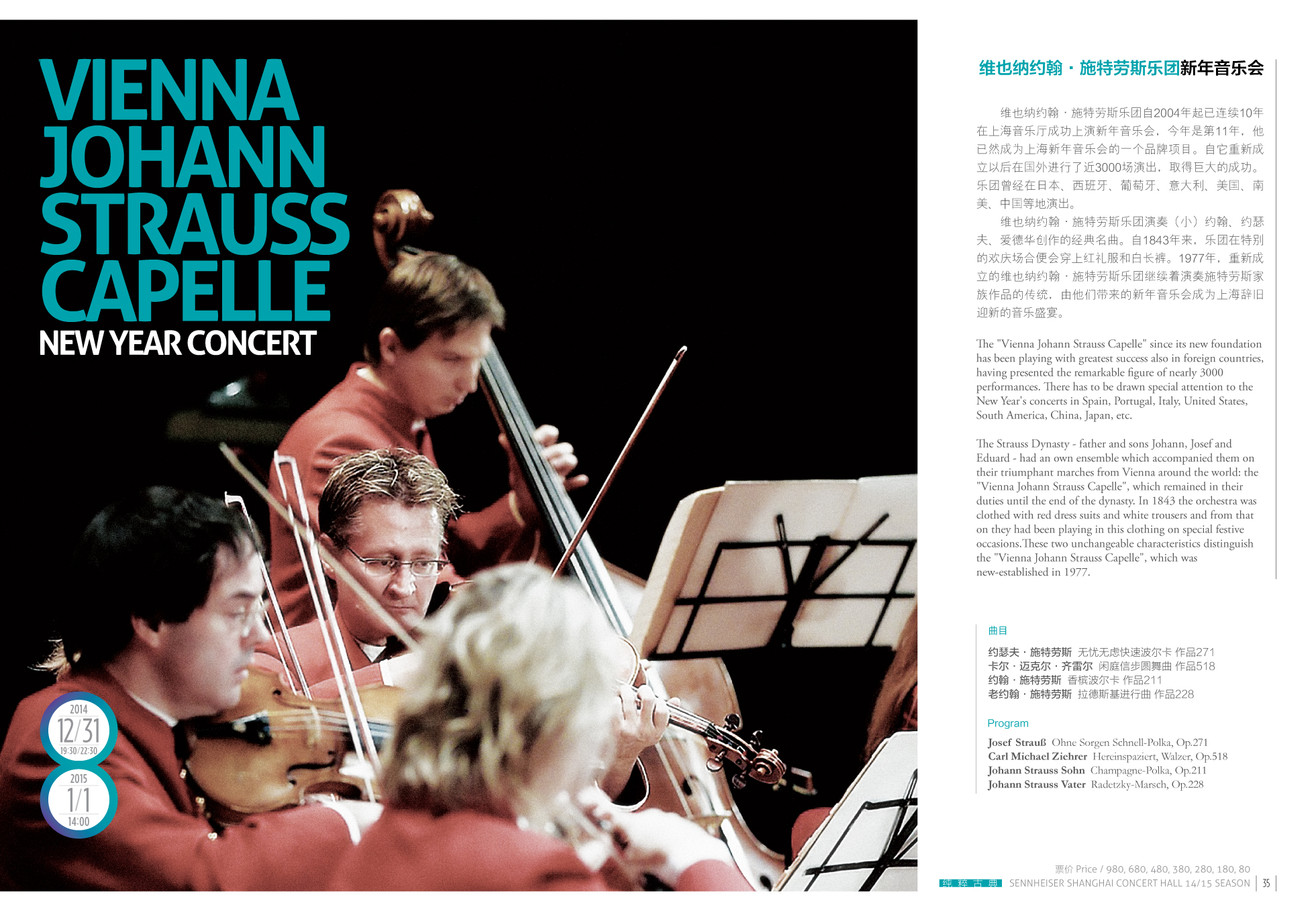 维也纳约翰·施特劳斯乐团演奏(小)约翰、约瑟夫、爱德华创作的经典名曲。自1843年来,乐团在特别的欢庆场合便会穿上红礼服和白长裤。1977年,重新成立的维也纳约翰·施特劳斯乐团继续着演奏施特劳斯家族作品的传统,由他们带来的新年音乐会成为上海辞旧迎新的音乐盛宴。