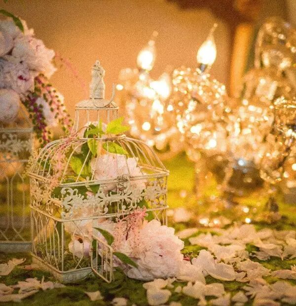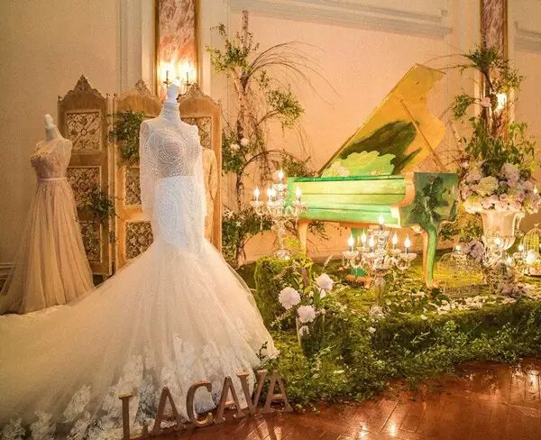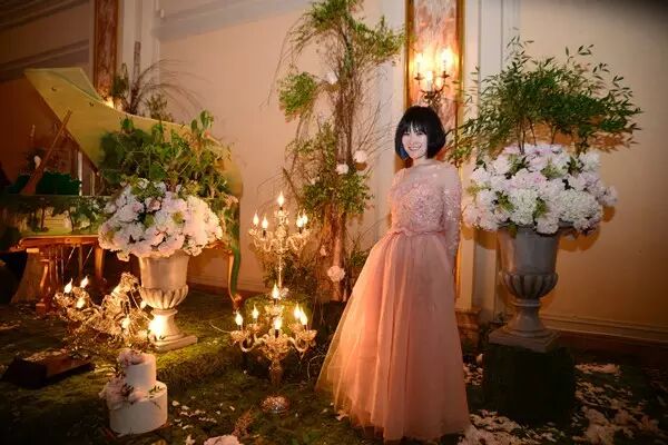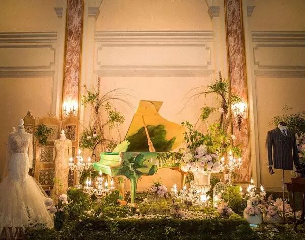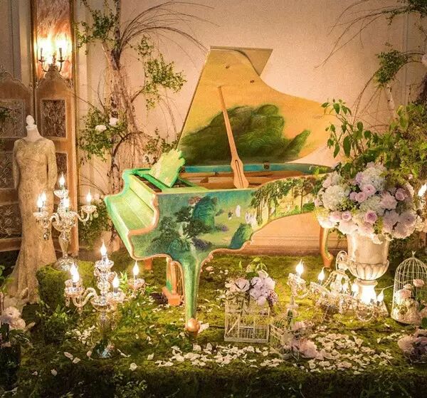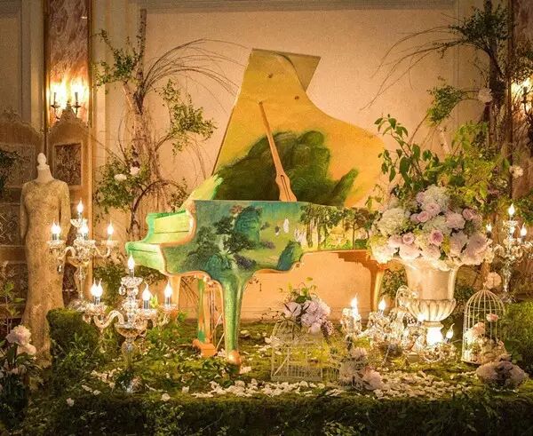 走进音乐厅,映入眼帘的是维多利亚时期的庭院之间精致的屏风掩映着嫩绿的柳枝,一簇簇淡粉的蔷薇与芍药之间摆放着一台爬满翠绿青苔的古旧钢琴,水晶烛台闪烁着明明灭灭的光辉,映照着纱衣礼服上细碎的晶光与层层叠叠蝉翼般的裙摆,宛然走入拉斐尔前派的油画。
