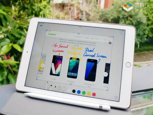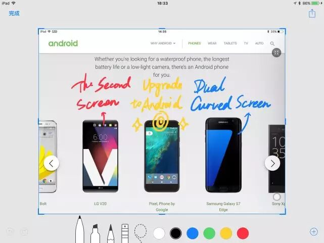 iOS 11中,Apple Pencil有了更多的应用场景。按键截图后,截好后的图像会化作方框缩至屏幕左下角。点击方框则可进入标注界面,用户可以使用Apple Pencil对截图进行备注,还可以插入手写签名、图形箭头等内容。