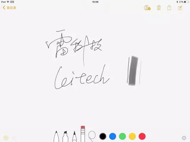 在锁屏状态下,使用Apple Pencil轻点屏幕,即可自动跳转至备忘录新增的手写模式,在备忘录中笔的粗细和截图注释中有所不同。