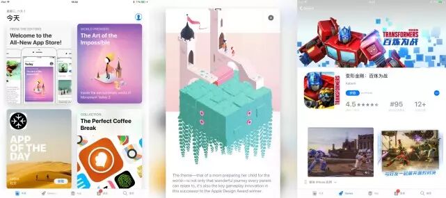 新版App Store采用了简洁美观的圆角举行卡片式设计,蓝白主色调,内容形式丰富,不过目前汉化还不太完全,大部分内容都是英文。游戏和App的详情界面则采用了全屏式设计,突出应用的评分,并且会自动播放游戏视频。