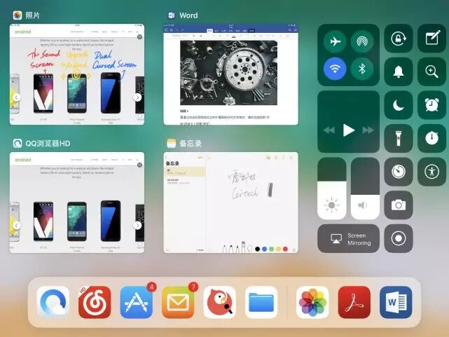 任意界面向上滑动Dock或双击Home键,可进入带有全新设计的控制中心的多任务界面(iPhone有所不同)。在系统设置中可以添加控制中心的功能数量,iOS 11中加入了屏幕录制等新控制项。值得一提,后台任务不再支持上滑关闭,而是需要长按应用窗口来呼出左上角的关闭按钮。