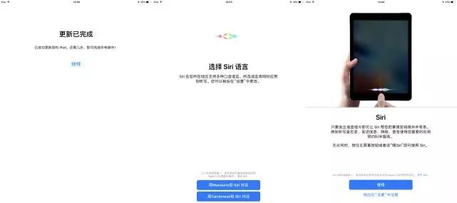 新系统更新完成后首先就是提示要设置Siri,目前中文可以选择普通话和广东话两种口语种类,当然如果你不想设置也可以选择跳过,之后就可以进入主屏幕。