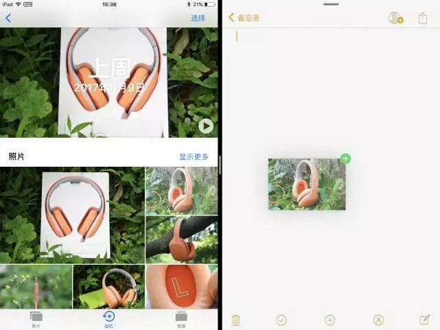 此外,新系统在分屏模式下也支持将相册中的图片通过拖拽的方式,直接插入备忘录或邮件中。