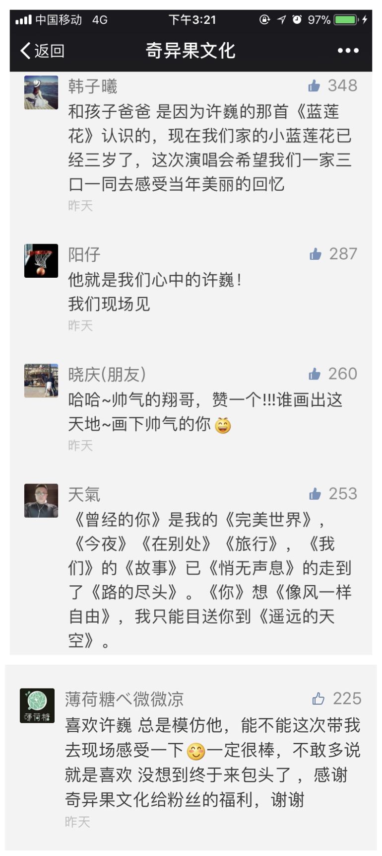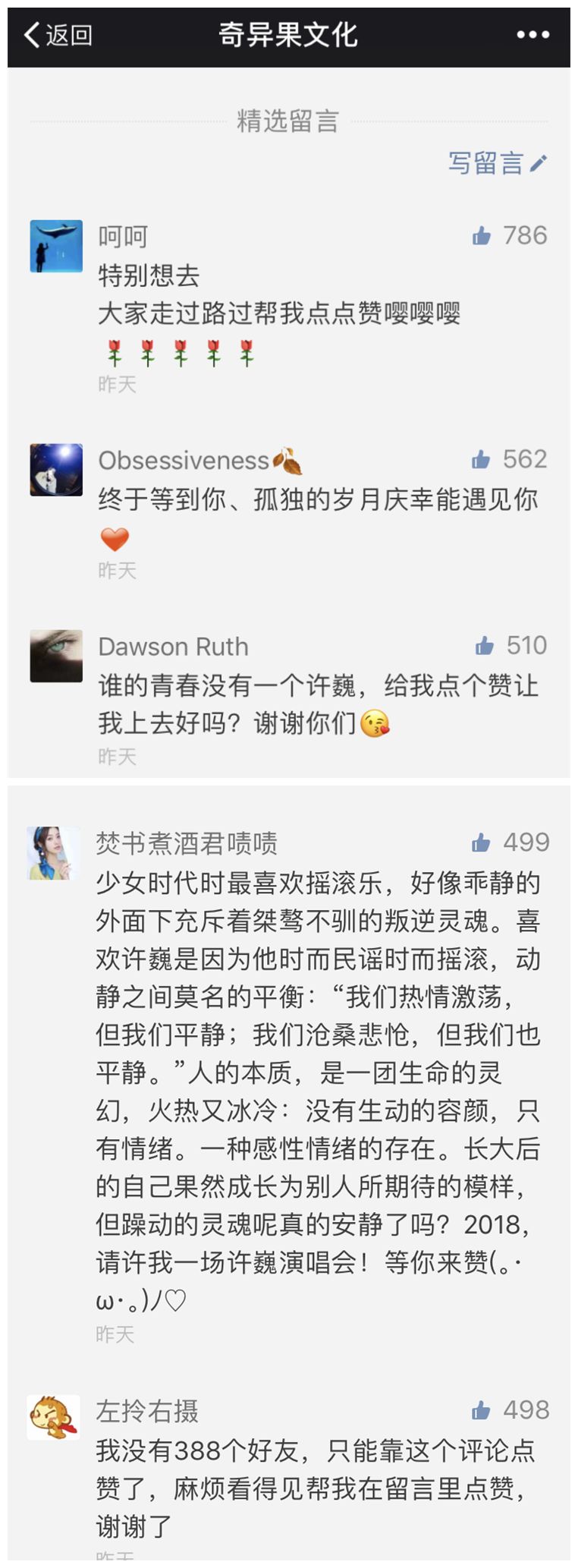 2、开始集赞送一张价值1680元门票,可是一张根本抵挡不了粉丝们的热情!主办方在集赞上又增加到5个中奖名额,留言区集赞也从前五名增加到前十名!只是为了给更多粉丝中奖的机会~善良可耐的主办方将会在演唱会前期陆续增加获取门票的活动!第一轮中奖信息已经在平台上公布,希望大家能够及时关注奇异果文化最新发布的信息,小编希望接下来你就是那个幸运儿~