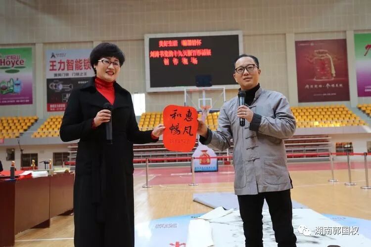 12月9日,娄底市全民健身服务中心主任、娄底书法与研究会副会长刘涛创作书法作品后合影。