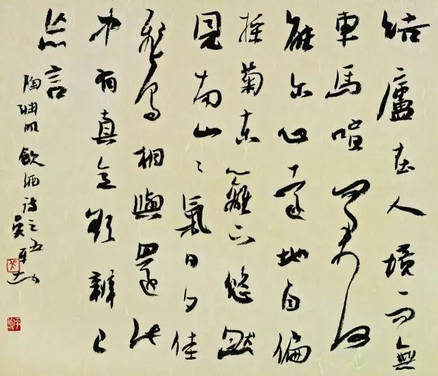 平均在行草上,比较朝性子上走,厚重中有奔逸,腾挪中有韧力。他特别注意内在节奏的起伏荡漾,在紧张的开合中找平衡的点位,贯气、回旋、跳荡、奔逸。他的书法把那种内在的运势通过线条的架构变化,通过那种一气呵成的气势来完成。他的这种变化,。五年前我们在一起写字,他就开始这样子写,于我有了一种陌生感,那时他的笔在他的手里很有杀伤力,他敢于用长线,敢于夸张,敢于下笔,愣劲憨劲和必要的法度张合在一起,渐渐地写到了现在。这种写法,圈内人认同,圈外人似乎不理解,实际在明清的调子中有这种因素影子。平均在寻找着这种书法的语言以期达到理想高度。