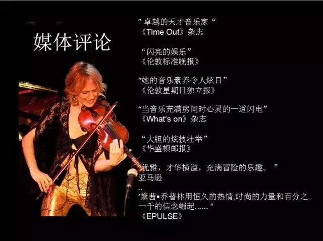 土耳其,墨西哥,德国和纽约……黛茜.乔普林乐队的每场音乐会都赢得热烈的掌声,它将带给您前所未有的音乐之旅。以喜悦和灵感,将古典音乐的旋律美引入到每一个的音乐流派,黛茜.乔普林的小提琴跨界,真正以音乐探索未知的领域。