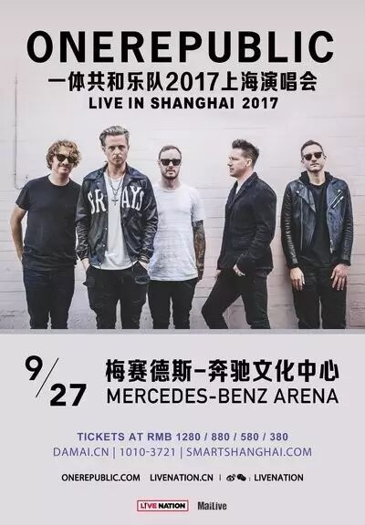 上海作为OneRepublic全球巡演计划中,中国内地唯一的一站,让这次机会变得更加难能可贵,9月27日,以摇滚的名义,享受顶级现场带来的快感!喜欢的歌迷千万不要错过!
