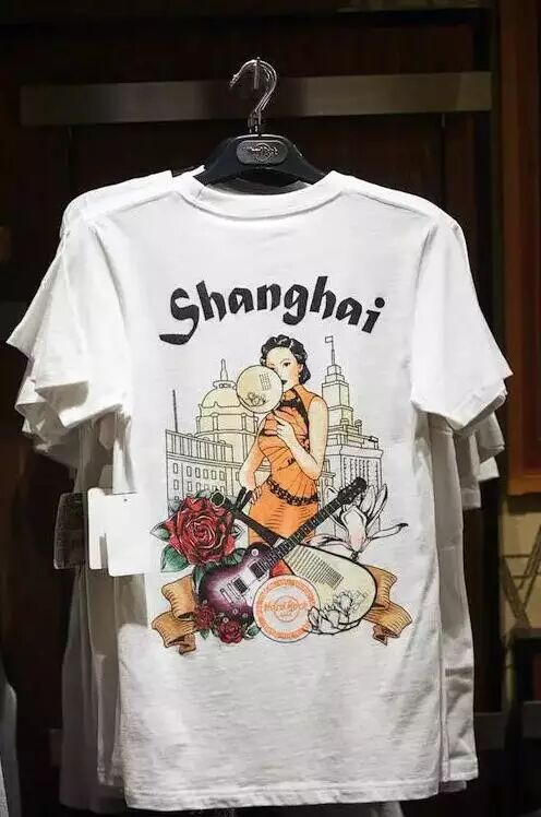 可别小看了这件上海城市的专属T恤。以外滩的西式建筑为背景,手持团扇半遮面的女郎,橘色的旗袍衬出其凹凸有致的身材,就连看上去只是配角的月季、琵琶也显得格外出彩细致。