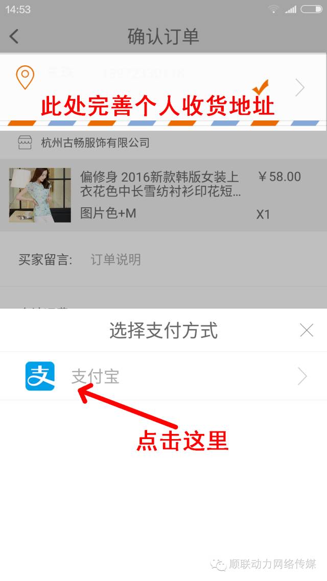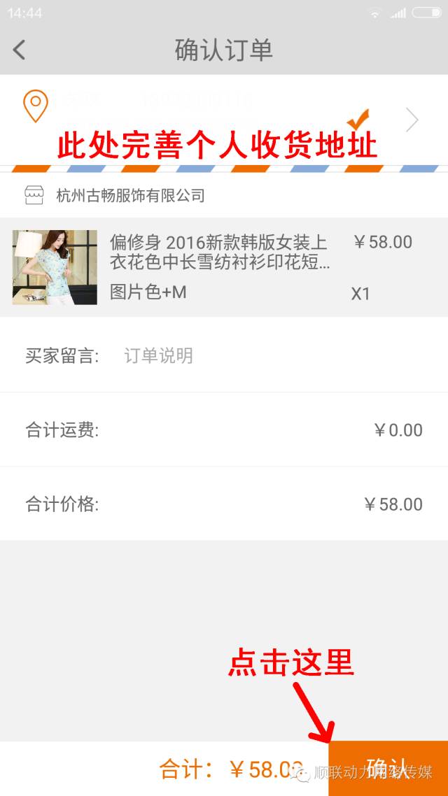 第六步,确定颜色、尺寸、数量等,完善收货地址,确认购买(见下图)