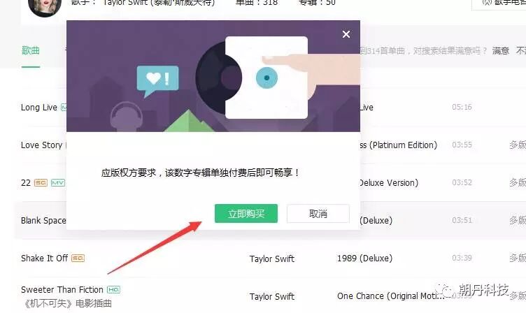 打个比方,很多喜欢听欧美音乐的朋友应该都知道泰勒斯威夫特,在QQ音乐搜索她的歌曲,然后愉快的点击享受一下,OK,“应版权方要求,该数字专辑单独付费后即可畅享!”
