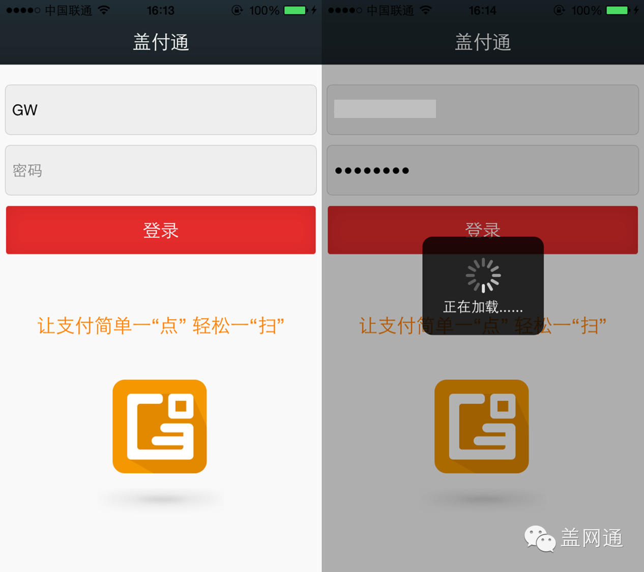 打开“盖付通”,输入「GW号」和「密码」,即可快速登录。