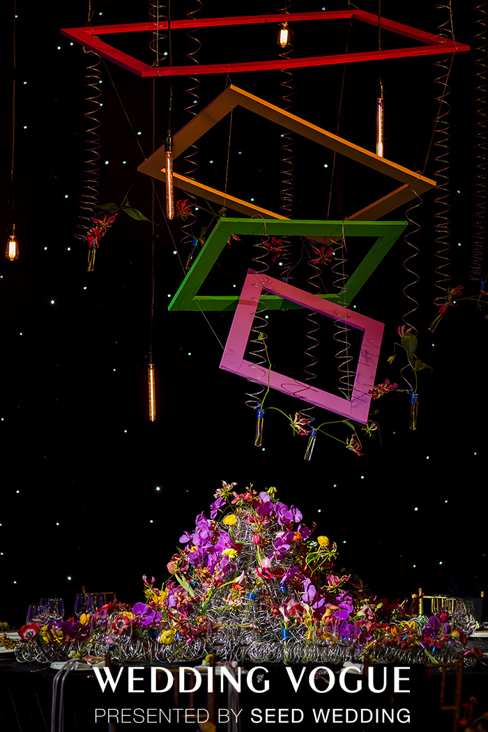 根据主题,现场在色彩的运用上比较大胆,几乎把所有色系都用上了。赤橙黄绿青蓝紫,来体现年轻人眼中看到的世界是缤纷多彩的。同时,在整个宴会设计的布景中,舞台构景也突破了常规,整个舞台设计打破了原有的所谓中心舞台或者偏台的方式,而是选择了一个角落设计的方式,这种设计的好处是,可以将整个宴会厅比较局限的空间进行最大化的利用,可以容纳下最多的人。材质上,也是采用了很多异材质,金属与花卉缠绕的桌花,上方随性垂挂的彩色油画板错落有致,长满灯泡的拱门都成了此次设计的几大亮点。
